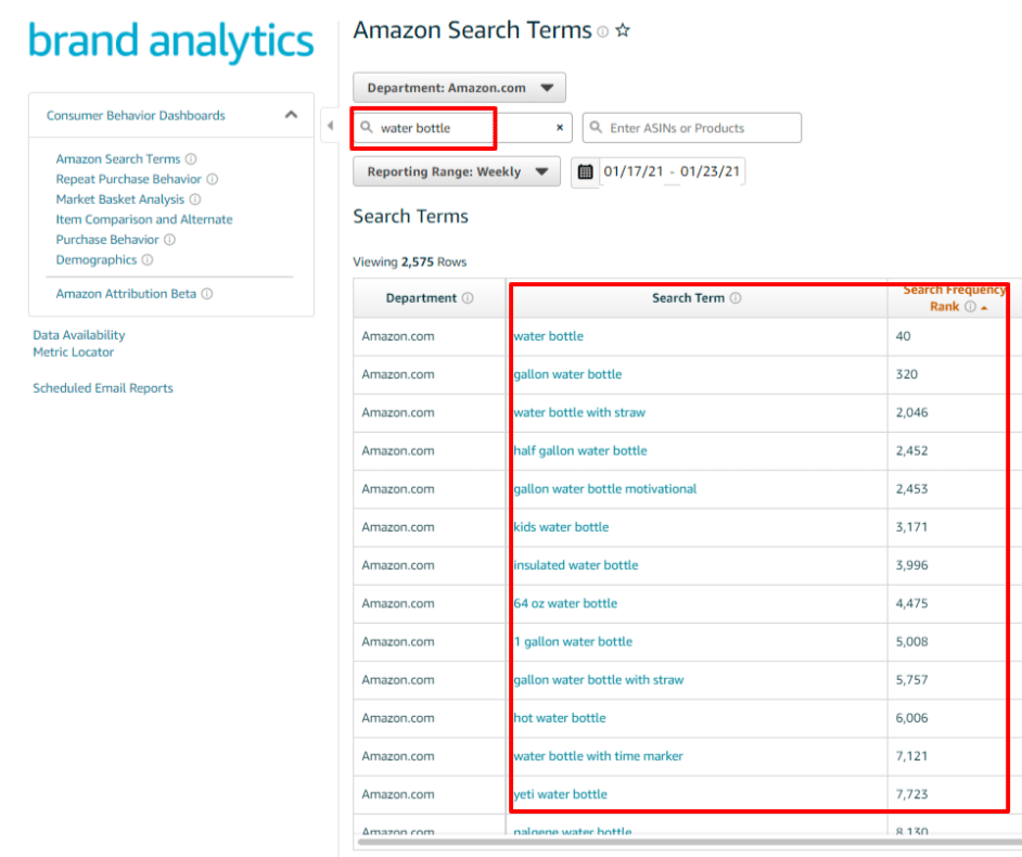 For our water bottle example, registered brand sellers and vendors can look at the Brand Analytics Report, enter the keyword “water bottle,” and get an idea of how often people search that term on Amazon. By entering keywords, as shown below, you’ll be creating a seed list that you can use for Sponsored Product or Sponsored Brand campaigns.