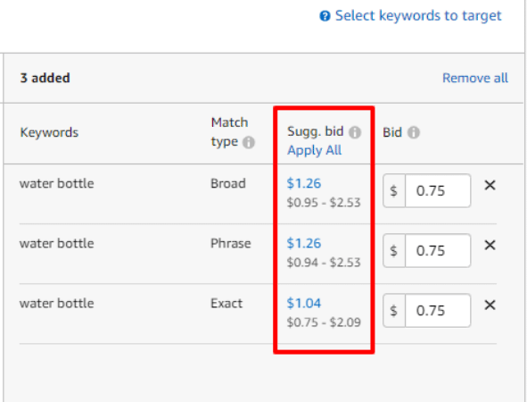 When creating the campaign, Amazon data shows the suggested bid and the bid range for each keyword match type, as shown below. This information helps you establish your budget by seeing which high-level keywords are cost-efficient, and which ones you may want to avoid.