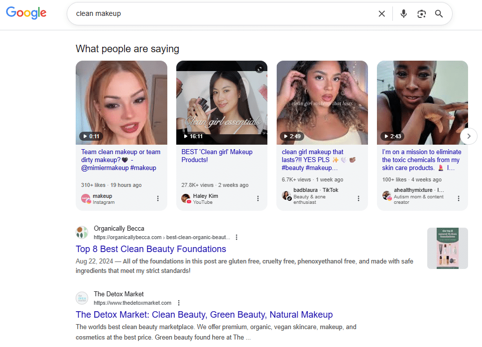 If you perform a search for the query “clean makeup,” you will see all of the usual SERP links and features you’d expect — people also ask, shopping, Reddit links, and more — but also a section titled “What people are saying.” It’s a featured section with a carousel of social posts from, in this case, Instagram, YouTube, and TikTok. The example below has been excerpted from the middle of a Google incognito SERP to illustrate the point.