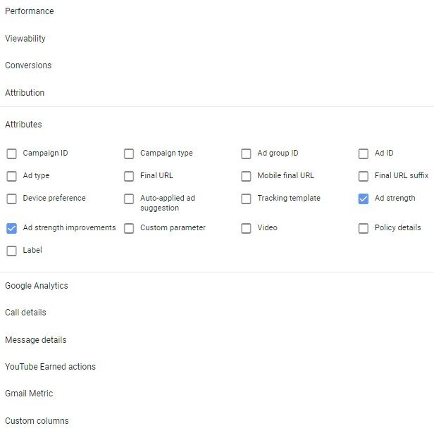You can find both “Ad strength” and “Ad strength improvements” in the Google Ads interface. Choose the “Ads & Extensions” tab, then the “Attributes” category, as shown below.