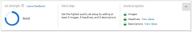 The ad strength meter, shown below, is prominent when you are building both responsive display ads and responsive search ads. Your score will change dynamically as you add more assets.