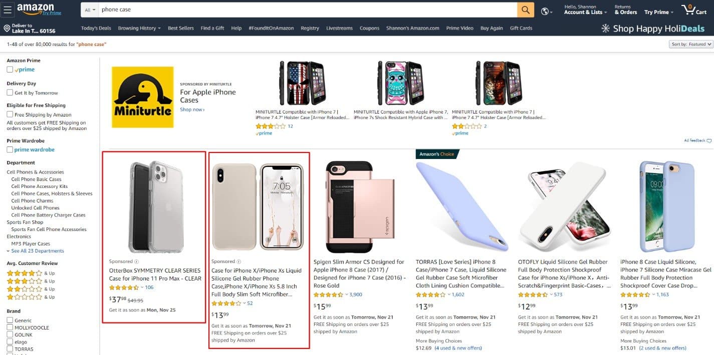 - Top of search (first page) ads show in the two to three sponsored product placements that are available on the top of the first page of results, as shown below.