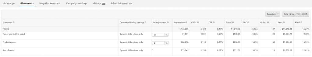 The most common application for placement adjustments is to boost bids in placements that have good conversion rates. In the “Placement” tab of your campaign, you can see a breakdown of how a campaign is performing by placement type.