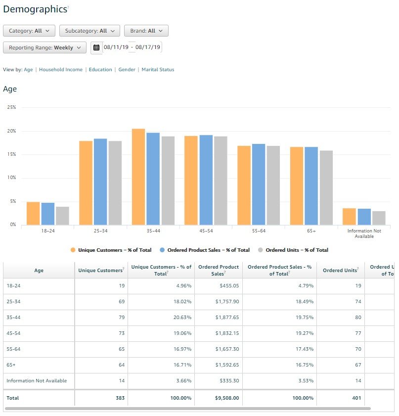 Amazon has traditionally only made demographic data available to those vendors who invested in Amazon Retail Analytics (ARA) Premium. Now, basic demographic data is available to all brand owners in Seller Central, including age, household income, education, gender, and marital status.