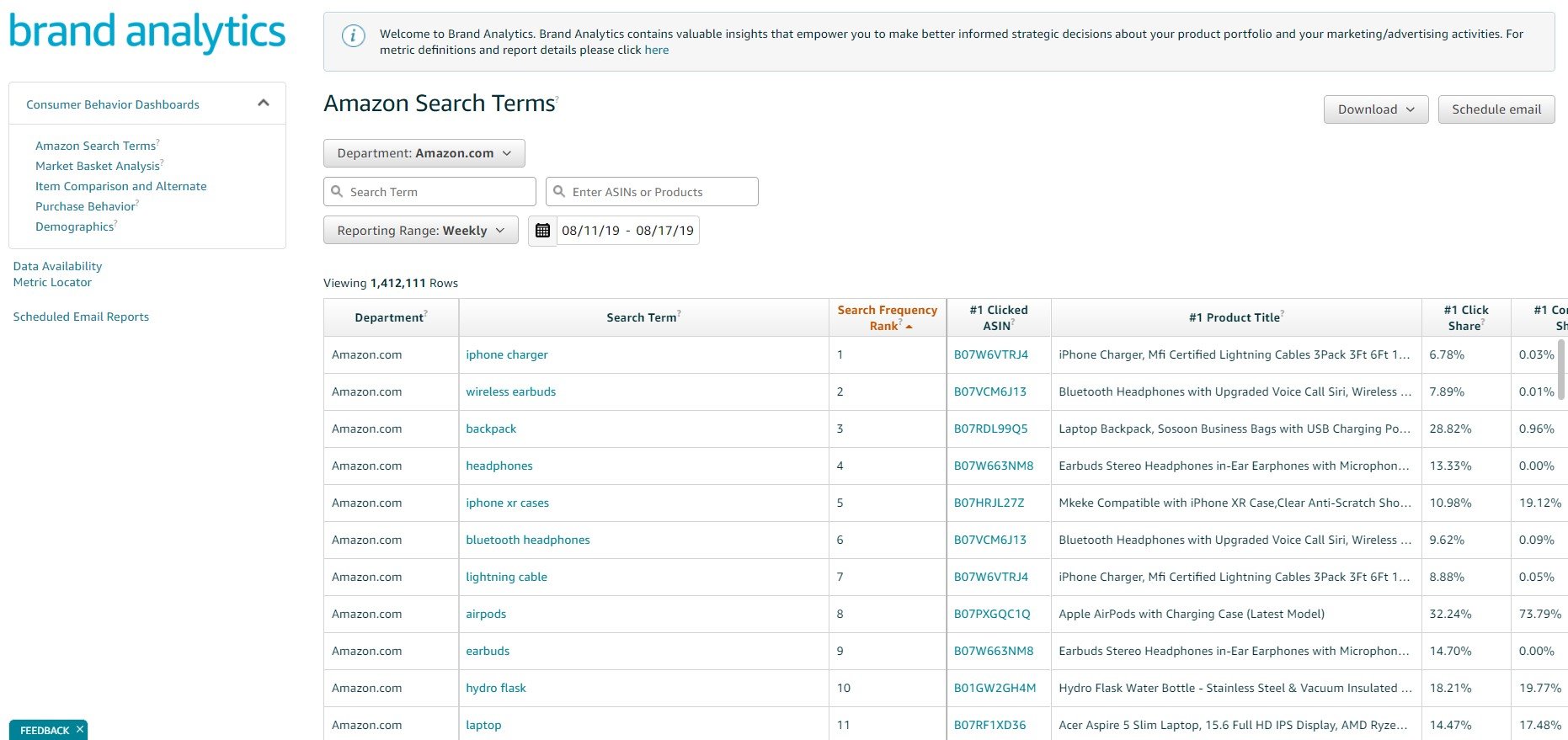 - #1 Clicked ASIN: The ASIN that received the most clicks for that search term during the reporting range.