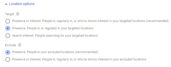The default location targeting option of Presence or interest: People in, or who show interest in, your targeted locations can open your campaign up to showing in places you might not want to. This targeting option might work great if you are a local florist, targeting your delivery area so that you show when someone currently outside your delivery area is searching for flower delivery within your geo-targeted area; but not so much if you are an ecommerce store that only sells and ships to the United States. This setting default allows Google to show your ads in other countries that you can’t or don’t want to service.
