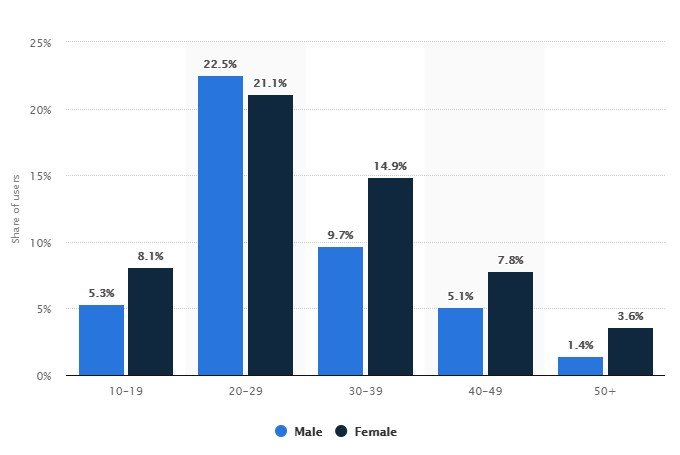 Distribution of U.S. Snapchat users by age and gender in July 2019. Source: Statista, 2019