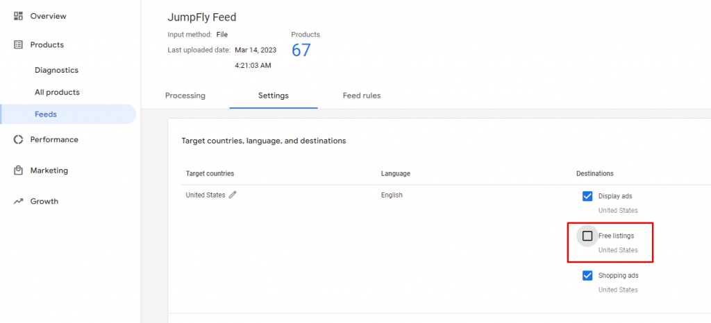 If you are already submitting a feed to Google Merchant Center, you’ll be able to tell right on the Overview page if you are opted into Free listings. If you are not, go to Products, and then to Feeds in the left-hand navigation. From there, click the Free listings box.