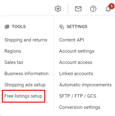 You’ll need to claim and verify your website (done using Google Analytics, Google Tag Manager, or a code added to your site), add your business information like your address and phone number, and load your feed. There’s a Free listing setup option in the dropdown under the gear in the upper right corner, which will walk you through it.
