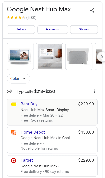 Shopping Knowledge Panel: available on mobile and desktop in select countries; these listings show on the right side of the Search Engine Results Page (SERP) and will show results by company, including price, availability, offers, and reviews.