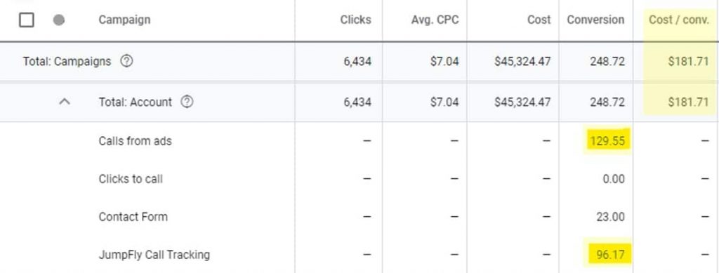 Without call tracking in place, only the 23 leads driven through ad clicks that resulted in a completed contact form would be trackable as conversions. As a result, the cost per lead (CPL) would be nearly $2,000. In actuality, the CPL for these campaigns was about $180. But without call tracking, we wouldn’t have been able to quantify the number of leads generated, or determine the true ROI of the campaign. Even if call extension conversions (“calls from ads”) were implemented, but not third-party call tracking conversions (“JumpFly call tracking”), the data would still show an incorrect CPL of $300, because the additional 96.17 conversions would not have been tracked.
