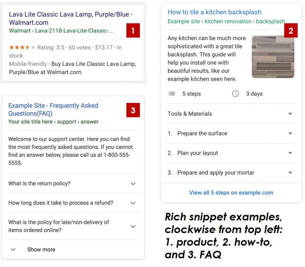This is a great time to go after rich snippets to make the rankings you already have more eye catching, and encourage clickthrough from the search results page to your site. Focus on your title tags, meta descriptions, and structured data. Google and Bing offer dozens of ways to optimize your content in ways that will earn you a rich snippet like the ones below.