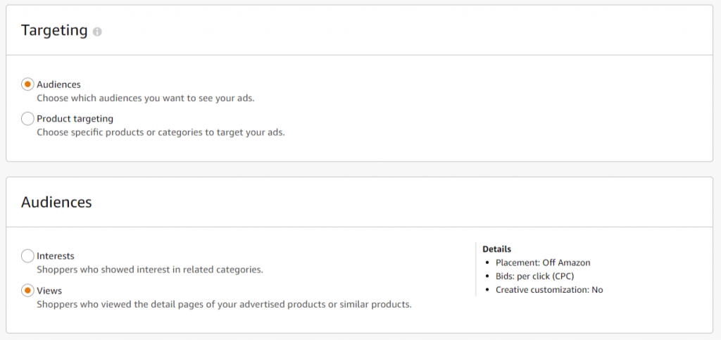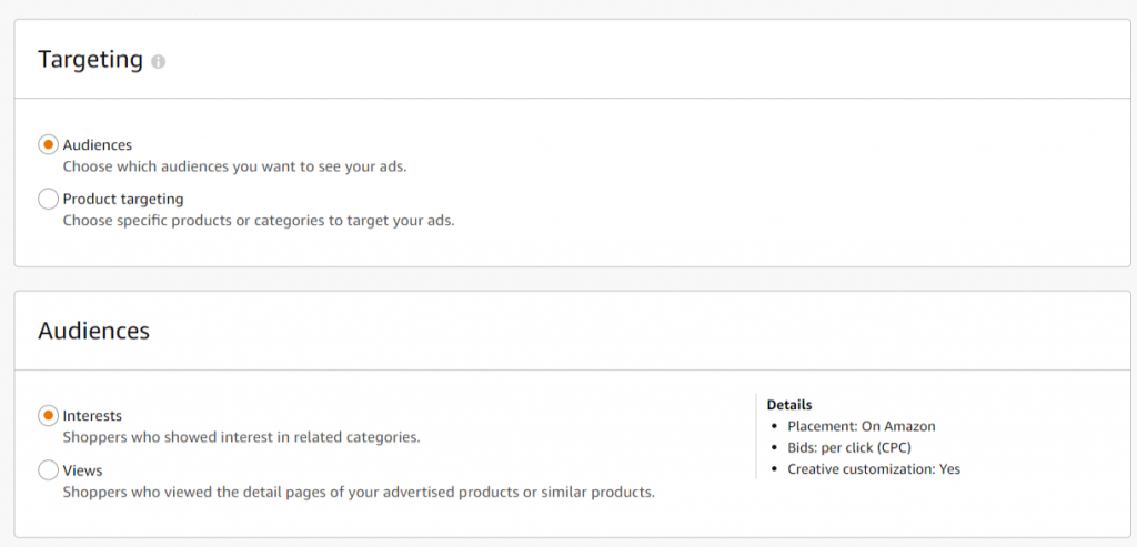 In the Amazon ads interface, you’ll select “Targeting,” and then click the radio buttons for “Audience” and “Interests,” as shown below.