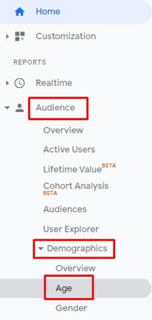 Google Analytics is a great source of demographic information — including age data — about your site’s visitors. To view it, select “Audience,” “Demographics,” then “Age,” as shown below.