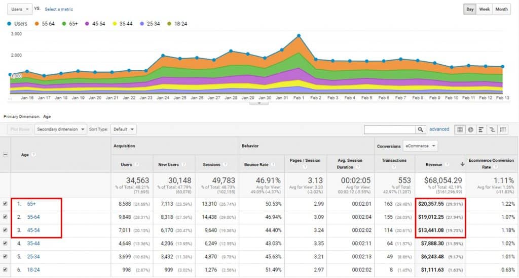 Our example data above showed that 78% of revenue comes from visitors aged 45 and up. Here’s how I would use that information.