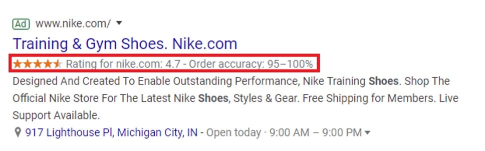 Google seller ratings will automatically show an aggregated 3.5- to 5-star rating for your brand within your text ads, as in the example with Nike above. Google may also display additional qualifiers, such as the total number of reviews or average order accuracy.
