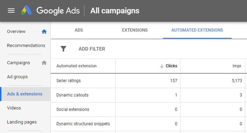 To check if your seller ratings are enabled in Google Ads, select “Ads and Extensions” from the left-hand menu, and then the “Automated Extensions” tab near the top, as shown below.