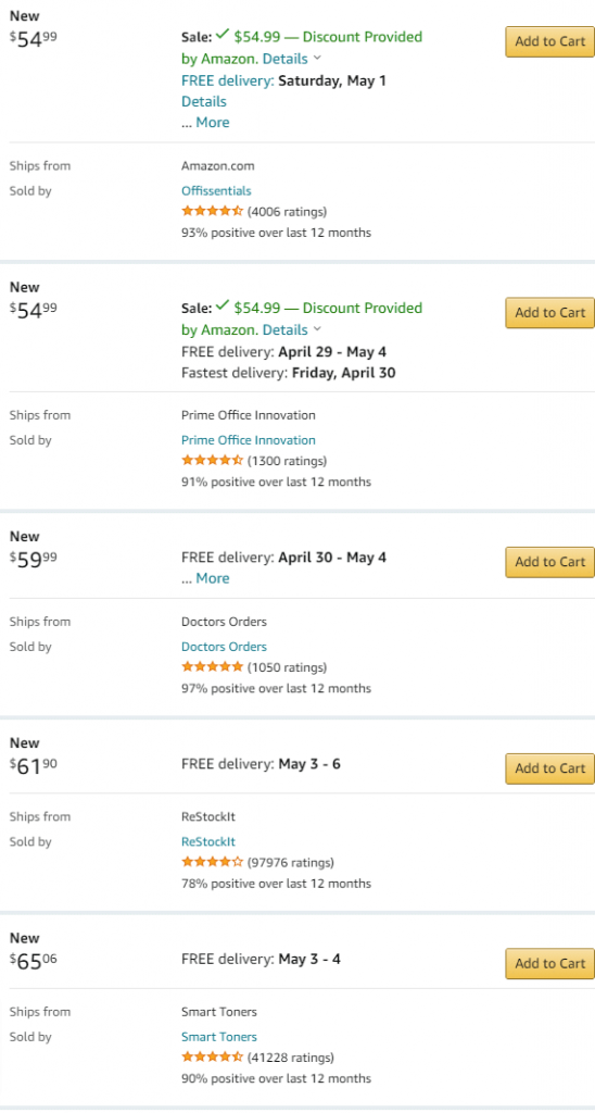 1. Price Competitiveness: Amazon wants to offer its shoppers the lowest possible price for any given product on its site. And that price competitiveness does not stop at the many offers that can exist for a single product (See the Tide example with 19 other offers on Amazon!) and includes other e-commerce sites. To be competitive and qualify for Buy Box Eligibility, you must offer the lowest price among the other Amazon sellers and across the e-commerce world. Amazon’s algorithms scrub other ecommerce sites like Walmart, Home Depot, Costco, and Kohls, to name a few.