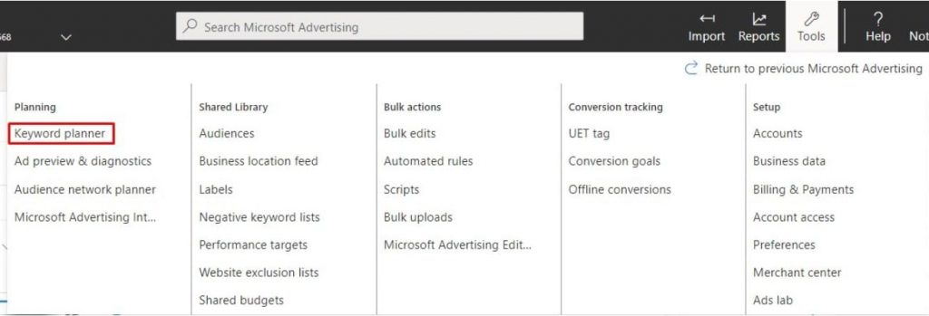 If you’ve used Google Ads’ Keyword Planner, you’ll know exactly where to find Microsoft’s version and how to use it; they’re remarkably similar. Just select “Tools” from the primary navigation in the Microsoft Advertising user interface, and choose “Keyword planner” from the “Planning” list on the far left.