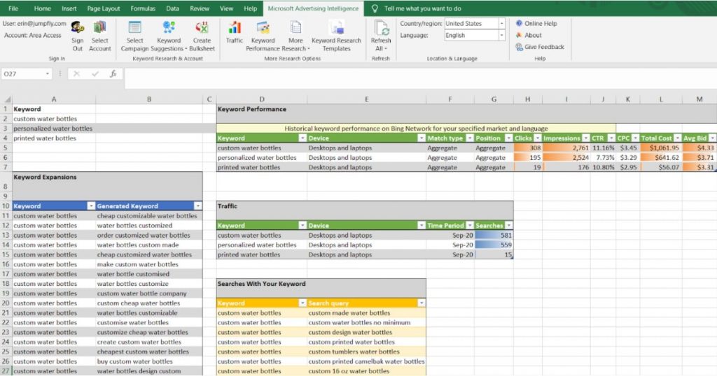 The second tool, Microsoft Advertising Intelligence, is a free Excel plug-in that you can download from Microsoft — it allows you to expand your keyword lists and gauge their performance. Its intuitive interface allows you to pull fine-tuned search data directly from Microsoft to make keyword research and analysis easier. As long as you have a Microsoft Ads account and use a 2007 or newer version of Excel, you’re just a few clicks away from an incredible research tool.