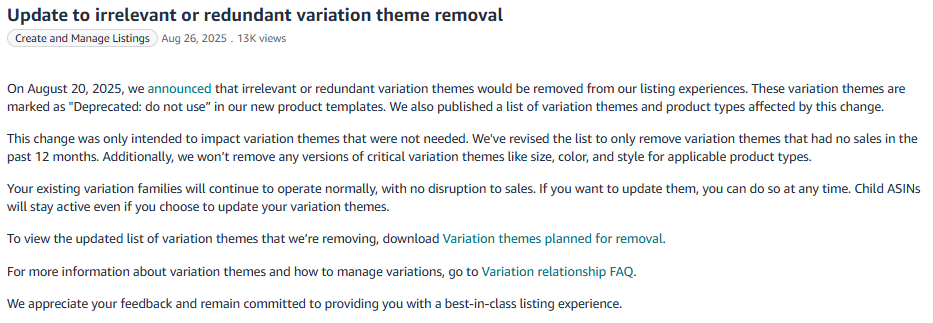 One of the largest pain points for sellers on Amazon is ASIN variations. From creating parent-child ASIN variations to how variations are displayed to the customer, there are many things to check and consider to make sure these are done correctly. Amazon’s latest attempt to simplify its catalog via variation themes started rolling out in September 2025 and is scheduled to be completed in November 2025.