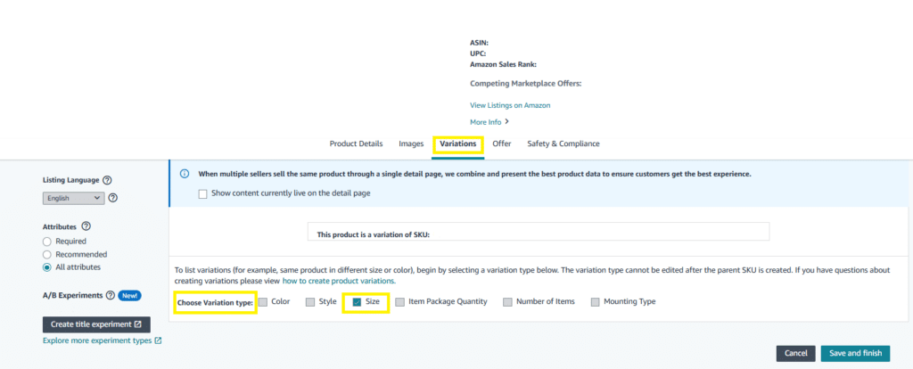 Then, select the variations tab, and you will find the variation types that currently apply to the ASIN in the areas we’ve highlighted:
