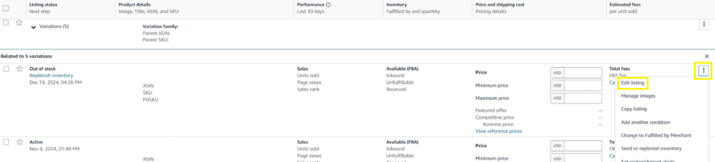 Then, find the variation family that you want to check. Choose one of the child ASINs to look at. Click on the button with three dots to open a dropdown menu, and select “Edit listing.”