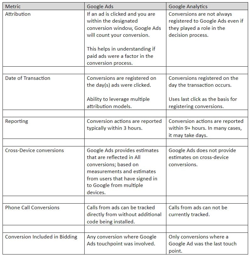 Now for the difference in conversion attribution between the two platforms, Google Ads and Google Analytics.