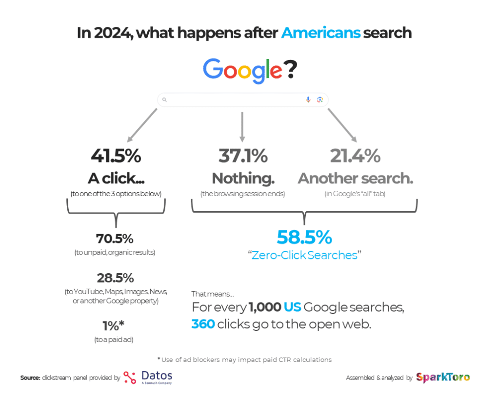 As AI Overviews were in their infancy last year (they launched in May 2024), SparkToro and clickstream data provider Datos released a study showing that only 29.3% of the searches result in an organic search click off of Google’s platforms to websites like yours.