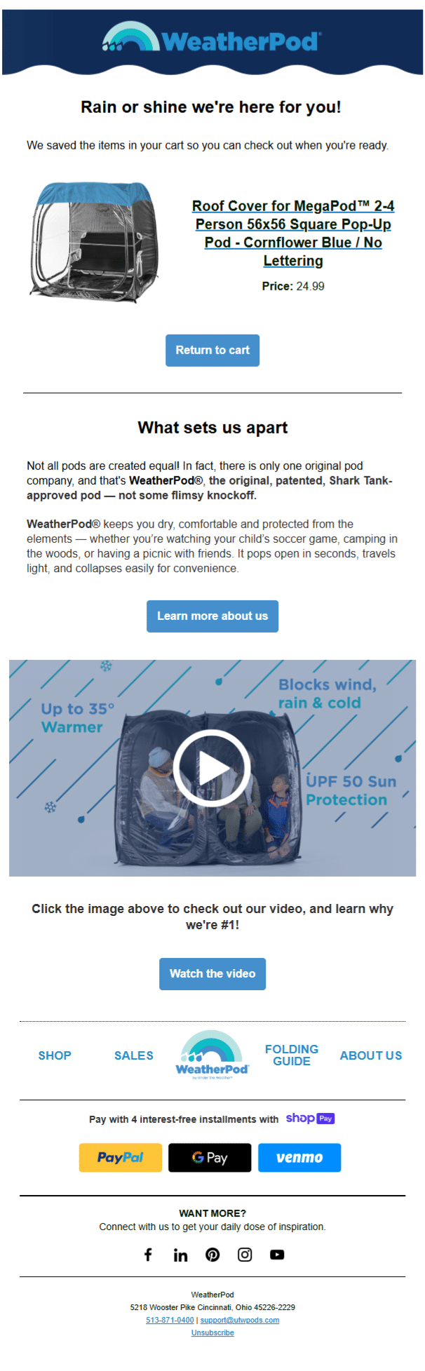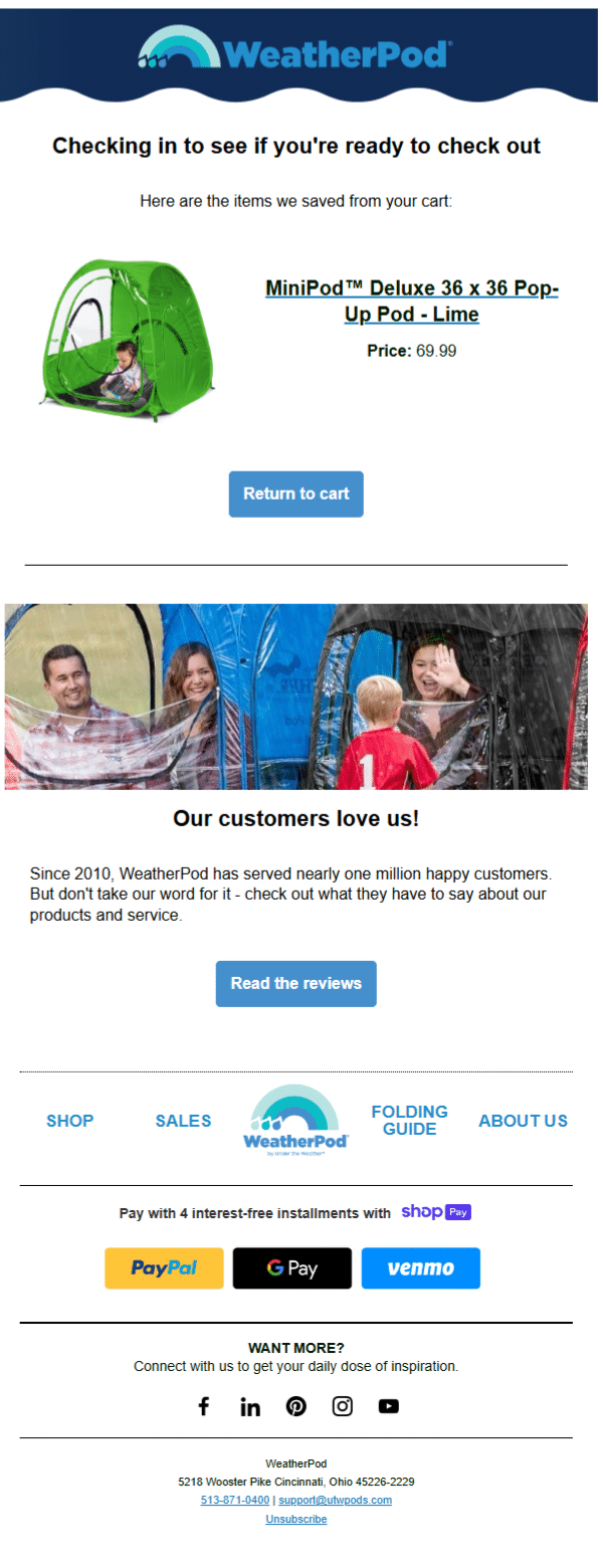 WeatherPod, a brand known for its protective outdoor pods and gear, was experiencing strong site traffic but struggled with a common eCommerce challenge: cart abandonment. Without a structured follow-up strategy in place, shoppers who left items in their carts often failed to complete purchases. WeatherPod needed a solution that could re-engage these customers in a way that felt natural and supportive.