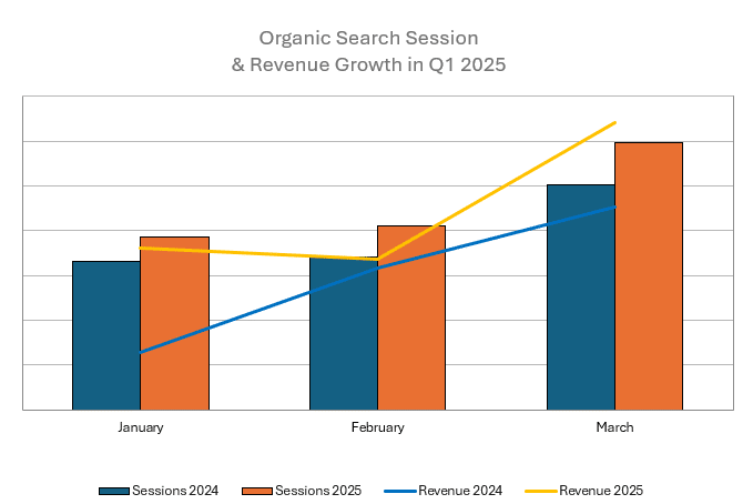 Power Planter’s Q1 2025 SEO performance is a great example of success in the growing zero-click world in which Google is keeping more organic search clicks on its own properties. Even during the seasonal lowpoint, and despite Google’s changing search results pages, organic search still drove 19% more sessions ad 49.2% more revenue than in Q1 of 2024. JumpFly ‘s strong strategic SEO spotlight on transactional content paired with Greg’s relentless focus on implementation and his development agency’s can-do attitude have combined to create the perfect environment for organic search growth.